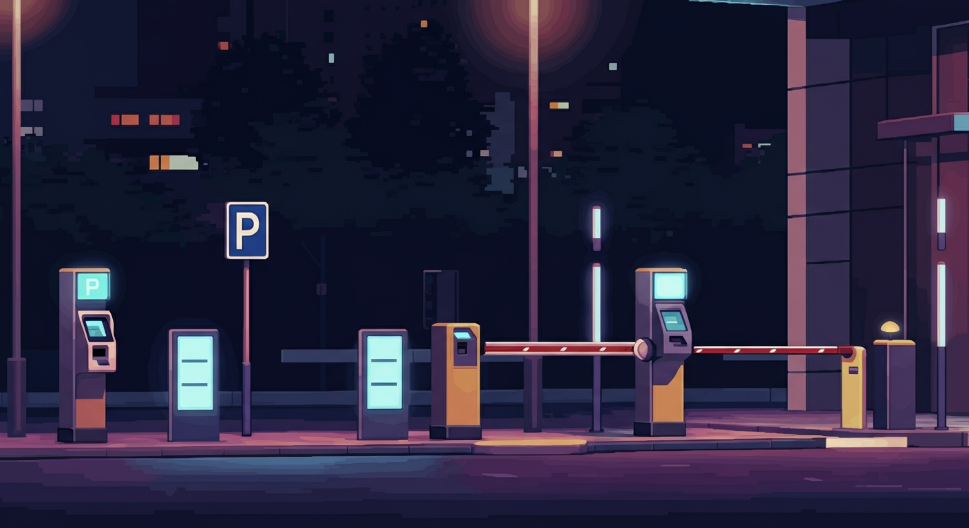 Sistem palang otomatis seperti di pusat perbelanjaan, dilengkapi sensor, CCTV, dan integrasi pembayaran digital.